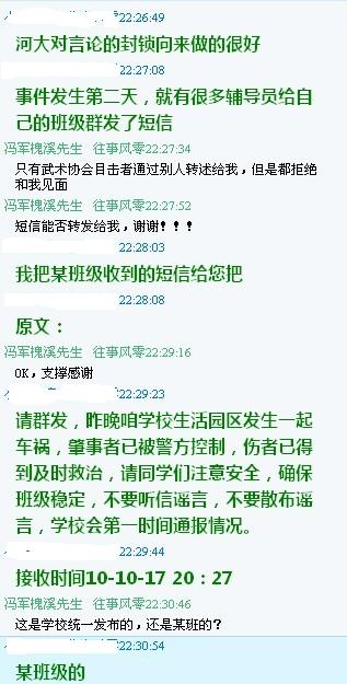 “请群发,昨晚咱学校生活园区发生一起车祸,肇事者已被警方控制,伤者已得到及时救治,请同学们注意安全,确保班级稳定,不要听信谣言,不要散布谣言,学校会第一时间通报情况。”接收时间10-10-17 20:27。