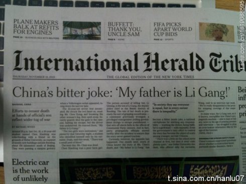 纽约时报国际版《International Herald Tribune》头版标题: China's bitter joke: "My father is Li Gang! 下图转自 @全球化领袖