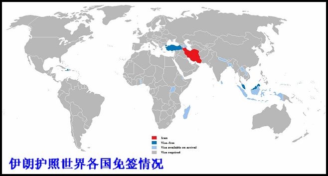伊朗,呵呵,红色是他自己,其余的蓝色和浅蓝代表免签和落地签。