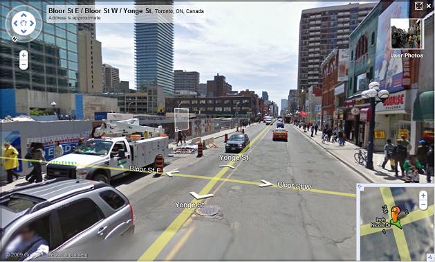 在http://maps.google.com的页面的search框里输入Toronto,地图就指向了多伦多,然后,将地图放大到最大,地图中心就指向了Yonge街和Bloor街的交界点。然后把那个棕黄色的小人拖到那个交界点,屏幕自动变化,就呈现出就如同你站在那里能看到的景观。下面是截图: