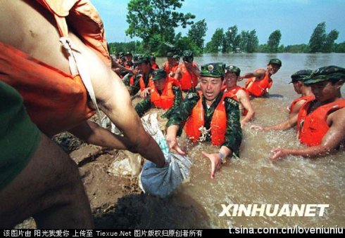 军人奋不顾身救灾一直被某些人当作歌颂党、政府的重要材料,但,从这个官方大力宣传的相片上能看到的可不是它的文字说的: